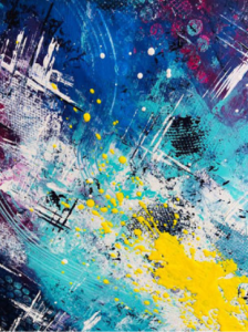 Cette énergie s’exprime au travers des formes, des couleurs et des textures qui prennent vie sur la toile et créent ce rayonnement… cette vibration.